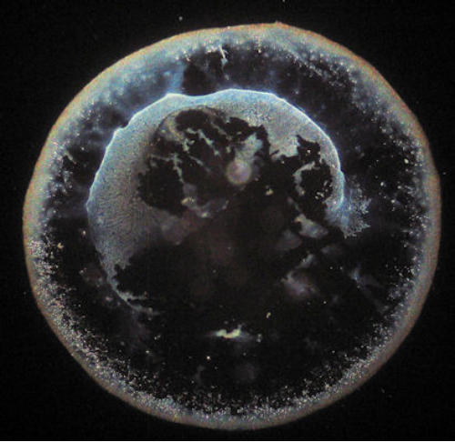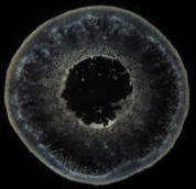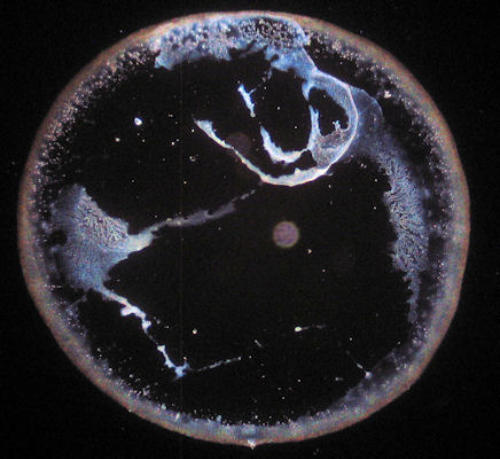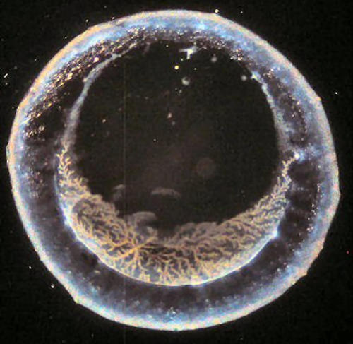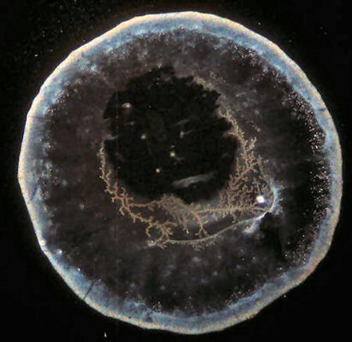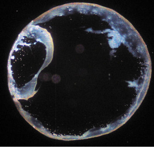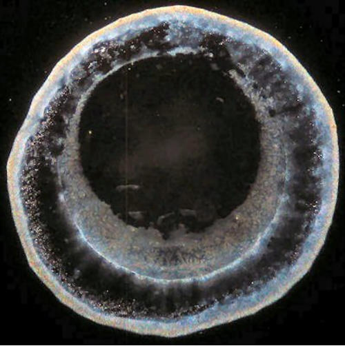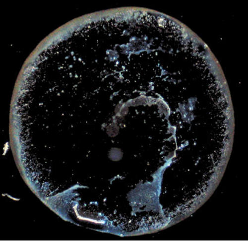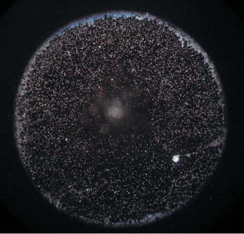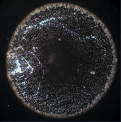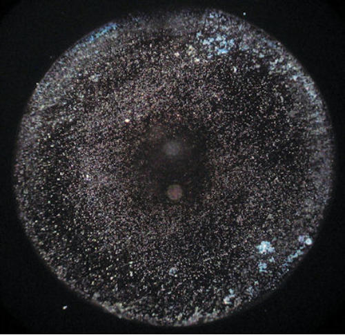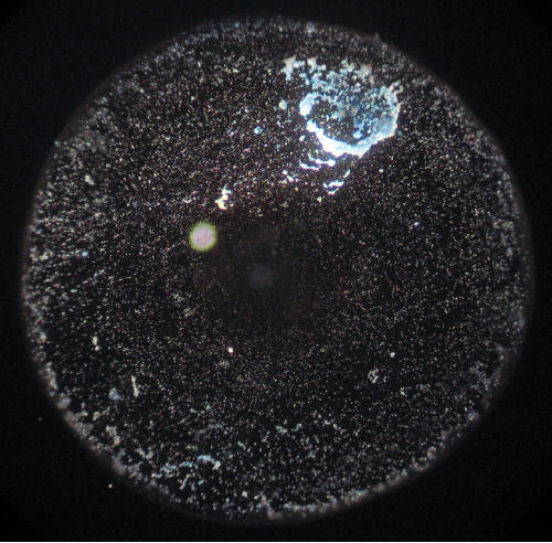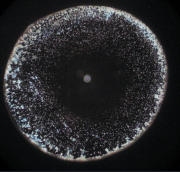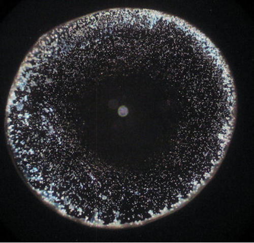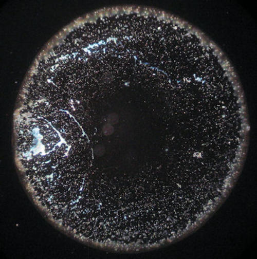 Getrocknete Wassertropfen sind von Natur aus sehr kontrastarm. Die feinen Strukturelemente sind mit einem Durchlichtmikroskop nur ungenügend zu sehen. Deswegen ist der Einsatz eines Dunkelfeld-Kondensors zu empfehlen.